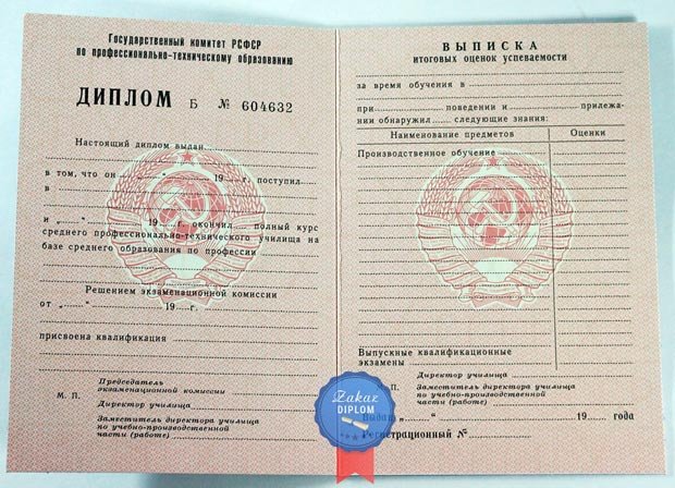 Все выпускники профтехучилищ получали еще диплом ПТУ СССР до 1994 года, хотя Советского Союза уже официально не существовало. Образец был разработан и утвержден в 1981 году и до 1994 года он не изменялся. Сегодня, покупая корочку, вы получаете в дополнение лист с оценками по изученным предметам. В корочках проставлены подписи руководителей учебного заведения, защитные знаки и печать. Также мы можем изготовить дипломы ПТУ СССР до 1994 года с отличием.